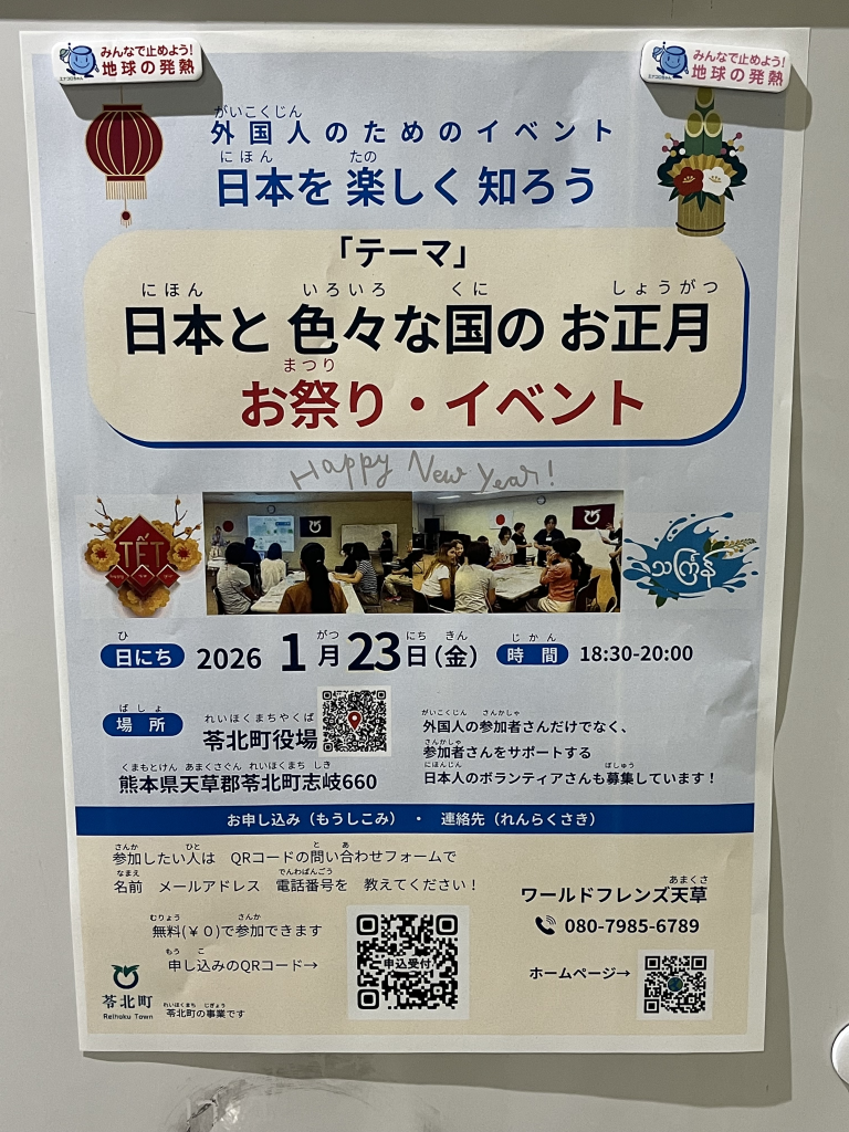 1月23日(金)苓北町で外国人のための交流イベントを開催しました(^_^)v 1. 日本のお正月文化を紹介写真を使い、日本の伝統的なお正月の風景を紹介しました。 紹介した文化: 門松、おせち、初詣、年越しそば、しめ縄、お年玉など。 交流の様子: 「年越し...